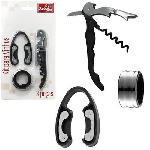 Kit para vinho com saca rolha de inox + cortador lacres e anel corta gotas