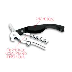 O Saca-Rolhas vem com 2° estágio flexível para não romper a rolha. Cabe no bolso! É considerado o amigo do garçom, pois é muito prático e funcional!