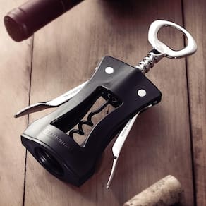O produto é confeccionado com corpo em ABS (plástico de alta resistência), hastes e abridor em zamak (liga metálica robusta) e espiral de aço inoxidável com revestimento antiaderente, facilitando a remoção da rolha..