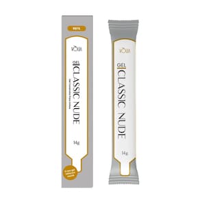 Contém: 01 - Gel Sachê Classic Nude Refil Unhas Alongamento LED/UV 14g, Vòlia 01 - Pote Branco com tampa 01 - Vedação encaixável antes da tampa 01 - Colher Plástica que pode ser armazenada por cima da vedação