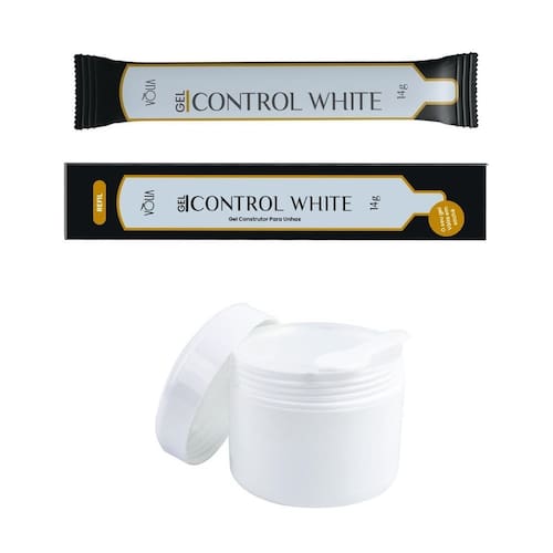 Contém: 01 - gel sachê control white refil unhas alongamento led/uv 14g, vlia 01 - pote branco com tampa 01 - vedação encaixável antes da tampa 01 - colher plástica que pode ser armazenada por cima da vedação