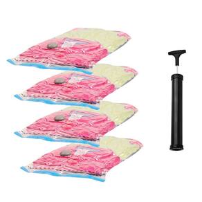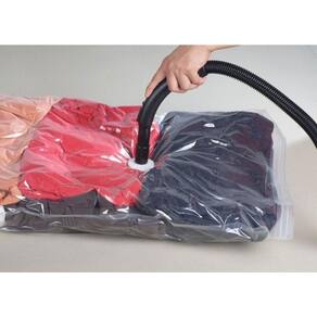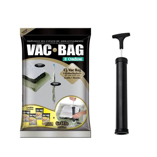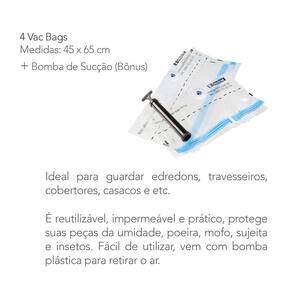 Kit de sacos a vacuo e bomba para retirar o ar. Vac Bag é ideal para guardar edredons, travesseiros, cobertores, casacos e etc, possui sistema a vácuo que permite triplicar o espaço de armazenamento. É reutilizável, impermeável e prático, protege suas peças da umidade, poeira, mofo, sujeita e insetos. Fácil de utilizar, você pode retirar o ar com a Bomba Plástica para Vac Bag ou com aspirador de pó.