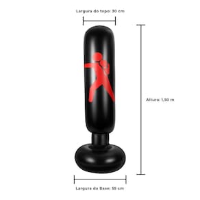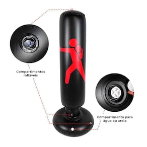 Precisão e Força na Utilização Saco de Boxe InflávelO Saco de Boxe inflável é um equipamento prático e pensado especialmente para amantes de esportes e artes marciais. Com ele, a prática de boxe, taekwondo, kick-box, muay-thai é possível em qualquer lugar e a qualquer momento, de forma acessível, prática e simples. Tudo isso, devido a sua facilidade de instalação. Para encher, pode usar uma bomba de ar ou a boca e pulmões. Para a base, pode ser utilizado areia ou água não, ele não vai vazar . Pronto, já pode começar com os golpes O melhor de tudo é que além de ser uma ótima opção para treinos, o saco de pancadas tem o tamanho ideal para ser utilizado por adultos e crianças em qualquer tipo de ambiente, seja interno ou externo. Dessa forma, ele atende a diversas funcionalidades, desde o alívio de estresse até a uma simples brincadeira ou momento de descontração com amigos ou familiares. O Saco Punching é um equipamento que permite realizar diversos treinos de boxe ou outras artes marciais em locais variados. É possível leva-lo para viagens, escritório, quintal, áreas internas e externas de casa etc. Ideal também para crianças praticarem atividades físicas e gastarem energia acumulada Ótimo para desenvolvimento da coordenação motora da criança.Para sua utilização, é apenas necessário encher a parte superior com ar, utilizando uma bomba ou até a boca e pulmões. Para encher a base, pode ser utilizado areia ou água e pronto, já pode começar com os golpes Sempre recomendamos o auxílio e monitoramento de profissionais para a prática de qualquer esporte. O Saco de Boxe Inflável pode ser utilizado dentro de casa, em áreas externas, escritório de trabalho ou academias. Além disso, como ele é transportado com facilidade, pode ser levado até em viagens. Benefícios do Saco de Boxe Inflável- Fortalecimento muscular- Melhora a coordenação motora- Melhoria nas articulações e flexibilidade- Aumenta a mobilidade e flexibilidade- Treinamento de boxe, taekwondo e outras artes marciaisEspecificações do Saco de Boxe Inflável- Cor: Preto com Vermelho- Material: PVC- Altura: 1.50 m- Diâmetro do Topo: 30 cm- Diâmetro da Base: 55 cm
