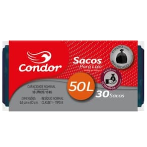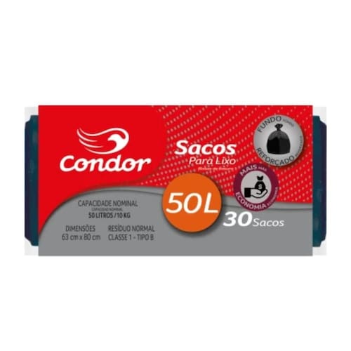 - Marca: Condor; - Referência: 972850; - Cor: Preto; - São resistentes ao levantamento com capacidade até 50 litros; - Rolo com 30 unidades; - Deve-se evitar colocar elementos perfurantes.