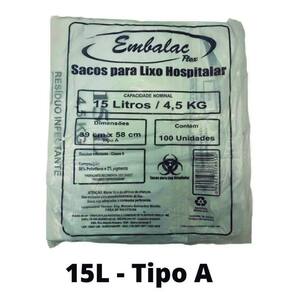 Saco de lixo hospitalar infectante 15l c/100 embalac Saco lixo hospitalar infectante 15l c/100 embalacPacote com 100 unidades de sacos de lixo infectante 15 litros embalac Sacos de lixo plásticos polietileno de alta densidade para acondicionamento de resíduos infectantesHospitalares descartados em geral, na cor branca, de uso único. Capacidade 15 litros ou 4,5 kgTamanho: 39cm x 58cmPacote com 100 unidades. Material: polietileno. Uso: lixo contagioso / infectante. Melhor custo x benefício do mercado. Confeccionado com excelente matéria prima. Especificações:Capacidade l : 15 litros.Capacidade kg : 4.5 kg.Indicações e instruções de uso:O saco de lixo hospitalar para acondicionamento de resíduo infectante é indicado único e exclusivamente paraAcondicionamento de materiais e resíduos infectantes hospitalares descartados em geral, oriundos de hospitais,Centros de saúde, clínicas de saúde, estúdios de tatuagem e serviços de saúde em geral. Produto de uso simples e único. Normas técnicas:Produto fabricado de acordo com a norma abnt nbr 9191:2008.