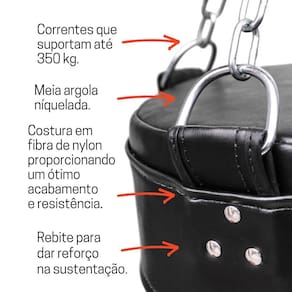 suporta sacos de pancada de todos os tamanhos, até 150 kg. Ele acompanha dois parabotls. Diferente dos parafusos comuns os parabolts possuem maior fixação pois eles funcionam como chumbadores dando toda segurança que o atleta necessita. Fabricado com aço de alta qualidade o suporte para saco de pancada é zincado não enferruja , sua pintura é feita com a tecnologia eletrostática. Possui 2 pontos de fixação para prender firmemente o suporte ao teto;