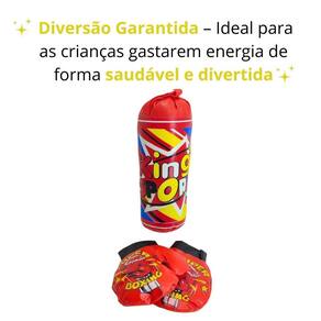 Saco de pancadas boxe infantil com luvas esporte wb7955 Estampa: king Tamanho: un Transforme a brincadeira em diversão saudável este kit de boxe é perfeito para crianças gastarem energia, desenvolverem coordenação motora e se exercitarem de forma divertida. Conta com 1 saco de boxe e 1 par de luvas, ideal para crianças acima de 03 anos, seu material leve, seguro e resiste, pode ser pendurado em qualquer local de fácil acesso para as crianças, além de ser uma excelente opção de presente para as crianças, o seu designer colorido chama atenção e torna a brincadeira ainda mais agradável. Garanta já o seu e proporcione momentos de lazer e atividade física para os pequenos Por que comprar com a imports - enviamos em até 24 horas; - produto de ótima qualidade; - produto testado e muito bem embalado para chegar em perfeito estado; - foco total no cliente. Informações importantes: - modelo: saco de boxe infantil com luvas - material: plástico pvc + further - medidas: Saco - 35x12 cm Luvas - 19x17x9 cm - material leve e resistente - fácil de pendurar - estimula a prática de exercícios físicos - recomendado para crianças acima de 03 anos - registro inmetro: 003292/2024