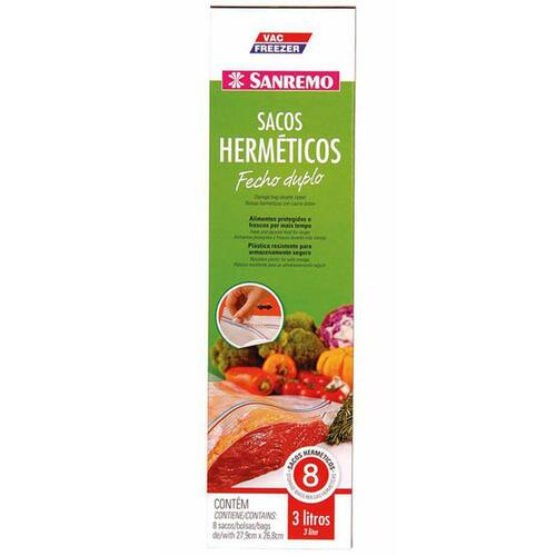 Saco Hermético Fechamento Duplo.Mantenha seu alimento fresco e protegido por mais tempo com o Saco Hermético Fechamento Duplo. Perfeito para armazenar seus alimentos, levar na marmita ou na lancheira da criançada. O saco conta com fechamento hermético duplo e tem capacidade para até 3L. Garanta já o seu. Produto descartável.Capacidade ml: 3.000mlDimensões por Peça: 77x45x285mmEmbalagem contém 8 unidades