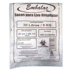 Saco lixo hospitalar infectante 30l c/100 branco embalac Saco lixo hospitalar infectante 30 litros c/100 branco embalac Pacote com 100 unidades de sacos de lixo infectante 30 litros embalac Sacos de lixo plásticos polietileno de alta densidade para acondicionamento de resíduos infectantes hospitalares descartados em geral. Na cor branca, de uso único. Capacidade 30 litros ou 9 kg Pacote com 100 unidades. Material: polietileno. Uso: lixo contagioso/infectante. Melhor custo x benefício do mercado. Confeccionado com excelente matéria prima. :Capacidade l : 30 litros. Capacidade kg : 9 kg. Largura: 59cm. Altura: 62cm. Indicações e instruções de uso: O saco de lixo hospitalar para acondicionamento de resíduo infectante é indicado único e exclusivamente paraAcondicionamento de materiais e resíduos infectantes hospitalares descartados em geral, oriundos de hospitais,Centros de saúde, clínicas de saúde, estúdios de tatuagem e serviços de saúde em geral. Produto de uso simples e único. Normas técnicas: Produto fabricado de acordo com a norma abnt nbr 9191:2008.