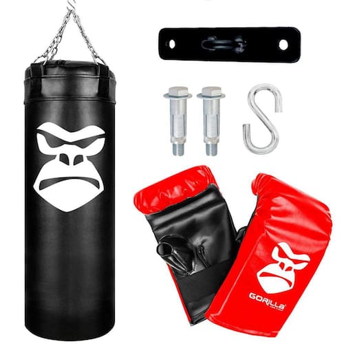 Saco Pancada Profissional 100 Cm + Luva + Suporte - Gorilla Cor: Vermelho O kit acompanha: 01 Saco De Pancada Profissional 100x90 cm (vazio) - Gorilla01 Par De Luva Bate-Saco - Gorilla01 Suporte Teto Retangular - Gorilla Saco De Pancada Gorilla Profissional 90 X100 - Gorilla Ideal para treinos de atletas profissionais e amadores, indicado para aplicação de chutes e socos altos (cabeça). Confeccionado em policloreto de alta resistência, o saco de boxe possuí 90 cm de altura por 100 cm de circunferência (o tamanho total contando desde o fundo do produto até o término da alça fica em aproximadamente 105 cm de altura). Quatro pontas de apoio reforçadas com dupla camada de PU acompanhadas com argolas, correntes e gancho em S, pronto para pendurá-loO saco de pancada é enviado VAZIO e possuí um zíper na parte superior facilitando o enchimento. Especificações:Medidas: 90 cm de altura x 100 cm de circunferência;Produto enviado VAZIO;Peso suportado: até 50 kg; Materiais indicados para o enchimento: Retalhos: Em confecções (geralmente fornecem de graça ou são vendidas por quilo por um preço bem acessível). Estopas: Autopeças e lojas especializadas (são vendidas por quilo por um preço bem acessível). Raspas de borracha: Empresas de recapeamento de pneus. Serragem: Encontrada em marcenarias e empresas que produzem esquadrias de madeira (também fornecem de graça ou são vendidas por quilo por um preço bem acessível). Luva Bate-Saco - Gorilla Desenvolvida para a proteção necessária ao atleta. Produzida em corino flexível e resistente;Revestido com duas camadas de diferentes densidades;Fecho no punho em elástico facilitando a colocação e proporcionando um melhor ajuste a diferentes tamanhos de pulsos;Abertura no dedão; Indicações:Ideal para treinos em sacos de pancadas, manoplas e aparadores. Suporte De Teto Retangular Para Saco De Pancada - Gorilla Suporta sacos de pancada de todos os tamanhos, até 150 kg. Ele acompanha dois parabotls. Diferente dos parafusos comuns os parabolts possuem maior fixação pois eles funcionam como chumbadores dando toda segurança que o atleta necessita. Fabricado com aço de alta qualidade o suporte para saco de pancada é zincado (não enferruja), sua pintura é feita com a tecnologia eletrostática. Possui 2 pontos de fixação para prender firmemente o suporte ao teto; Indicações: Para sacos de pancadas até 150 kg; Acompanham o produto:01 Gancho S02 Parabolts Garantia: 09 meses Fabricado por Gorilla Indústria e Comércio LTDA. Produto 100% nacional.