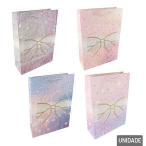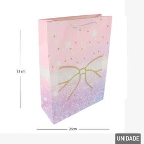 Sacola de Papel 32x26cm Laço com Glitter Col Leve suas compras ou presentes de forma elegante com esta Sacola de Papel encantadora! Medindo 32x26cm, ela é perfeita para ocasiões especiais, como aniversários, casamentos ou até mesmo para um dia de compras. O design de Laço, adornado com Glitter, traz um toque de sofisticação e charme, tornando cada detalhe ainda mais especial. Cada Sacola é uma verdadeira obra de arte, ideal para surpreender quem você ama. Feita de Papel de alta qualidade, esta Sacola é resistente e pode suportar itens pesados com facilidade, garantindo que seus produtos cheguem ao destino em segurança. Com alças trançadas são confortáveis, é prática e fácil de transportar.\nDisponível em cores e modelos . Sacola de Papel 32x26cm Laço com Glitter Color Marca : TINGS Tipo de material : Papel Cores ou Estampa : Color Dimensões do Produto : 32 X 26 X 10 CM Dimensões da Embalagem : 32 X 26 X 0,5 CM Peso Bruto (Gramas) : 0.078