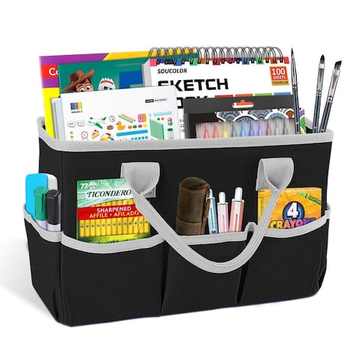 A bolsa Godery é boa para levar em viagens. A sacola que começou tudo. É a loja e bolsa de luxo favorita do professor, grande espaço para todas as necessidades de aula, como leitura de livros, tablet de desenho, caneta, tesoura, borracha, regras, papel, todas as folhas de trabalho, Trabalhos domésticos de estudantes, folhas de teste, etc. Mas também é bom para suprimentos de maquiagem feminina, suporte de berçário, arquivamento doméstico, artesanato de mães, chaves, bonecas infantis, etc. Há uma razão para isso - a bolsa é ideal para carregar praticamente tudo. Dobra-se para facilitar o armazenamento. Especificações: Material: poliéster 600D Duas cores: rosa com alças pretas Azul com alças vermelhas Medidas: 34,5 x 14,5 x 22 cm Alça dupla superior 14 cm A Sobre os bolsos. 1 compartimento central para organizar materiais de artesanato, ferramentas de aprendizagem, documentos de escritório, etc. 5 bolsos externos para marcadores, canetas, lápis de cor e muito mais. 2 alças de transporte são boas para viagens! Ótimo para carregar todos os tipos de produtos que você quiser. Um painel removível de suporte inferior para você escolher como usar. Pode ser utilizado como sacola de compras de supermercado, bolsa de viagem, bolsa de ferramentas de jardim ou bolsa de artesanato. Observação: Materiais de arte e outros acessórios não incluídos. Observe que todos os tamanhos são medidos manualmente. A margem de erro é de 1 a 3 cm. Um leve odor é normal. Ele desaparecerá imediatamente quando colocado em um espaço ventilado por alguns dias. Devido à câmera, luz e tela, a cor física pode variar. - Melhor solução de organização: tem grande espaço de armazenamento para artigos de papelaria de professores, livros, canetas de papel, artesanato, artes, maquiagem, materiais de escritório, cozinha doméstica, etc. - Muito armazenamento pequeno: exceto o armazenamento grande, há 5 pequenos bolsos externos, utilizados para organizar pequenas ferramentas, para que você possa acessá-las em um curto espaço de tempo. Fácil de tocar - Bem feita: a sacola artística é feita de poliéster durável 600D, 2 alças de transporte são boas para viagens! Bom design - Medidas: Tamanho total 34,5 x 14,5 x 22 cm, um papel duro na parte inferior para guardar todas as suas coisas, você não vai se preocupar com eles caindo