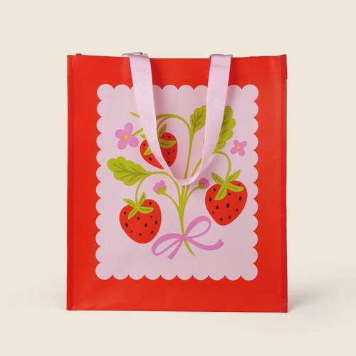 Com estampa de morango em vermelho vibrante, essa sacola alia funcionalidade e charme, sendo ideal para uso em supermercados, feiras, compras do dia a dia, organização doméstica ou até mesmo como embalagem reutilizável para presentes.