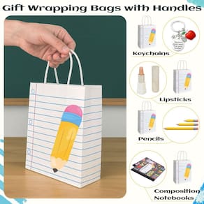 - Sacos de embrulho para presentes do primeiro dia de aula: use estas bolsas para presentes de festa no primeiro dia de aula, surpresas de férias ou fichas de agradecimento. Encha com doces, cartões de presente ou notas personalizadas para homenagear educadores. Ideal para presentes individuais e brindes de sala de aula