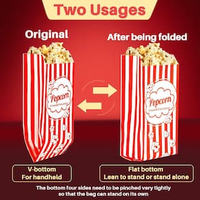 -?Sacos de pipoca descartáveis?: A parte inferior da sacola precisa ser dobrada para ficar plana. A embalagem contém sacos de papel descartáveis, cada saco de pipoca mede. A altura do saco de pipoca mudará quando dobrado. Para um adulto, eles podem ter cerca de. A altura do saco de pipoca muda quando dobrado. Para um adulto, eles podem ter cerca de. E são sacos de papel, então eles 'quando cheios de pipoca.