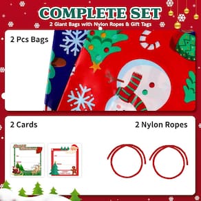 EverMerry Sacos grandes de presente de Natal, sacos de presente de Natal extragrandes de 183 x 152 cm, 2 peças, sacos de presente de Natal reutilizáveis grandes, saco de plástico resistente com - [Capacidade extragrande] Experimente a conveniência de nossas sacolas grandes de presente de Natal, medindo 183 x 152 cm, ótimas para guardar itens grandes como bicicletas, móveis e uma variedade de presentes de Natal. Ideal para qualquer ocasião festiva - [Resiliente e reutilizável] Feitas de material LDPE premium, estas sacolas de presente de Natal são projetadas para uso duradouro. Sua construção robusta garante que elas possam ser reutilizadas ano após ano para embrulhar presentes ou armazenar itens como roupa de cama ou travesseiros - [Design à prova d'água] Mantenha seus presentes seguros e elegantes com nossas bolsas de presente de Natal à prova d'água. Seja chuva ou neve, seus presentes permanecerão protegidos, tornando-os ótimos para qualquer condição climática durante a temporada de férias - [Uso versátil] Não apenas ideais como sacolas de Natal para presentes, mas também servem como soluções práticas de armazenamento para o uso diário. Ideal para organizar brinquedos, roupas e muito mais, elas serão uma adição valiosa à sua casa - [Conjunto completo de presente] Cada conjunto inclui 2 sacos de presente de Natal lindamente projetados, 2 laços de nylon vermelhos para fechamento seguro e 2 etiquetas de presente para mensagens pessoais. Torne seus presentes de férias fáceis e sinceros com as bolsas de Natal EverMerry's