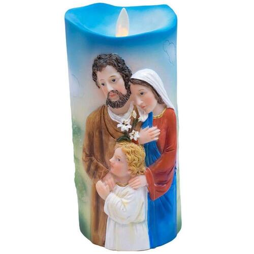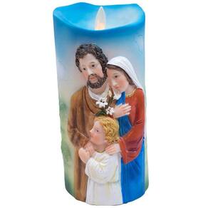 Sagrada Família Luminária Vela 17.5cm - Enfeite Resina Sagrada Família Luminária Vela 17.5cm - Enfeite Resina Vela artificial de 17.5 cm de altura formato cilíndrico com imagem de Sagrada Família. Luz laranja fogo, após ligado o enfeite vai parecer uma vela em chamas. Detalhes da Luminária estilo Vela da Sagrada Familia: Material: resina; Funcionamento: 2 pilhas AA; Peso 0,350 gramas; Altura 17,50cm.