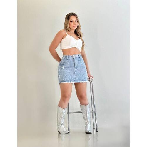 Saia Jeans Curta com Strass Barra Feita A Saia Jeans Curta com Strass é puro estilo e atitude. Confeccionada em jeans de lavagem moderna, conta com detalhes em strass que trazem brilho e sofisticação ao visual. A barra feita garante acabamento delicado e reforça a versatilidade da peça. Ideal para composições despojadas ou mais ousadas, pode ser combinada com cropped, t-shirts ou camisas, resultando em looks casuais e cheios de personalidade.