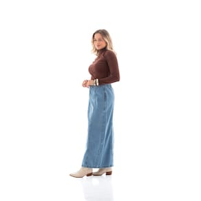 Cós Fino Cintura Alta Aquele ítem clássico, atemporal e versátil a Saia Jeans, pode trazer ao look um visual que vai do elegante ao casual, em um passe de mágica, dependendo da blusa e sapato combinados. Composição:100%Algodão