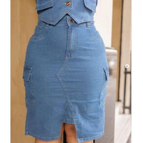 Saia jeans  feminina plus size midi, possui tecido liso com bolsos nas laterais