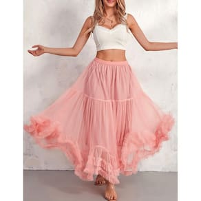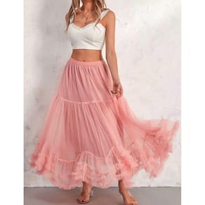 - Design: saias maxi em camadas para mulheres, feitas de tule macio e fluido, esta saia de cintura alta apresenta babados delicados e camadas em camadas que criam uma silhueta etérea e sonhadora. O esquema de cores e a alfaiataria simplificada o tornam uma âncora de guarda-roupa versátil, que combina facilmente com sandálias para brunch ou saltos altos para eventos noturnos, oferecendo elegância digna de passarela nas transições do dia para a noite