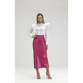 A saia midi de vinil com aplicações de paetes possui cintura alta e , garantindo um ar mais despojado para suas produções. É uma peça incrível para fazer combinações com croppeds. Aposte nessa trend.