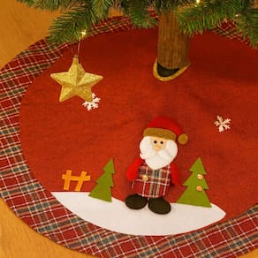 Finalize sua decoração natalina com elegância utilizando a saia para árvore de Natal modelo prime, confeccionada em tecido linho vinho com aplique de Papai Noel em pelúcia e borda xadrez festiva, trazendo aconchego e sofisticação ao ambiente.