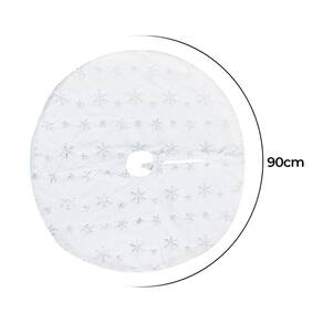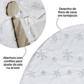 As dimensões da saia são: diâmetro de 90cm e espessura de 2cm, com peso aproximado de 240g. Sua cor é branca, combinando perfeitamente com qualquer decoração de natal.