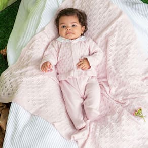 Acompanha um casaquinho super charmoso me Tricô e uma linda manta, também em tricô extremamente macia e delicada, que vai deixar o seu bebê quentinho e muito confortável.