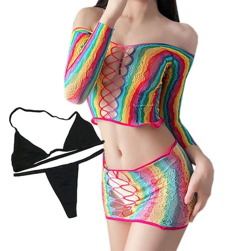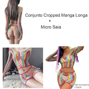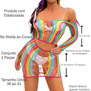 Saída De Praia Arrastão Multicolorido Arco Iris - 2 Peças + Biquíni Marquinha de Fita em Tecido.