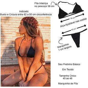 Biquíni Marquinha: Material: 91% Poliester e 9% Elastano. Cor: Preto Básico. Produto em tamanho único que veste do tamanho 40 ao 46. Ideal para tamanhos 40/42/44/46. Serve em pessoas com busto e cintura entre 82 à 95 cm de circunferência. Indicado para praia, piscina, clínica de estética, em seu bronze natural ou a jato. Sutiã com fita inteiriça no pescoço e fita com posição de ajuste nas costas. Marquinha de 6 mm na alça superior em volta do pescoço e 9,5 mm abaixo do busto. Calcinha possui fita inteiriça, sem posição de ajuste. Fita da calcinha com 9,5 milímetros. Não possui reguladores para não interferir na marquinha e não se mover.