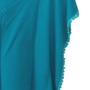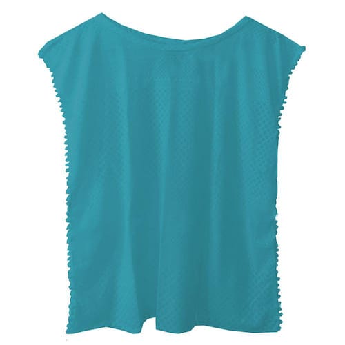 A saída de praia infantil turquesa é a peça ideal para compor o look de praia ou piscina nos dias mais quentes. Em tecido fino com desenho geométrico bem delicado, semitransparente e o charme fica por conta dos grelôs branquinhos nas laterais.