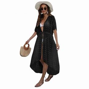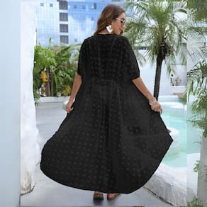Eleve seu estilo à beira-mar com esta elegante saída de praia. Feita em tecido leve e transparente com detalhes em poás, proporciona charme e sofisticação ao seu look de verão.
