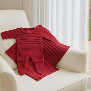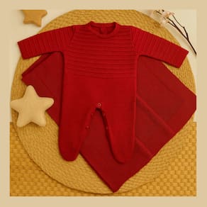 O conjunto traz o toque aconchegante do tricot para vestir seu amor com muito estilo. A manta e o macacão são peças versáteis, Perfeito para presentear!