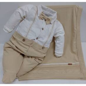 Características do Produto: - Macacão manga longa em malha ultra confort, super macio e confortável. A gola e a parte superior frontal em linnho. Detalhe de bordado imitando alças que dão um charme todo especial a peça. Recorte na cintura, botões aplicados, e bolsos fake. Abertura frontal por botões personalizados na parte superior. Botões de pressão na parte inferior e entre pernas. Um luxo! - Manta também em malha confort. Detalhes de bordado e etiqueta da marca, combinando ao macacão. Medidas aproximadas da manta: 70cm x 80cm. - Gravatinha borboleta fixada por botão com elástico. Pode ser removida. Este conjunto é ideal para deixar seu bebê arrumadinho e estiloso desde os primeiros momentos.