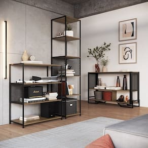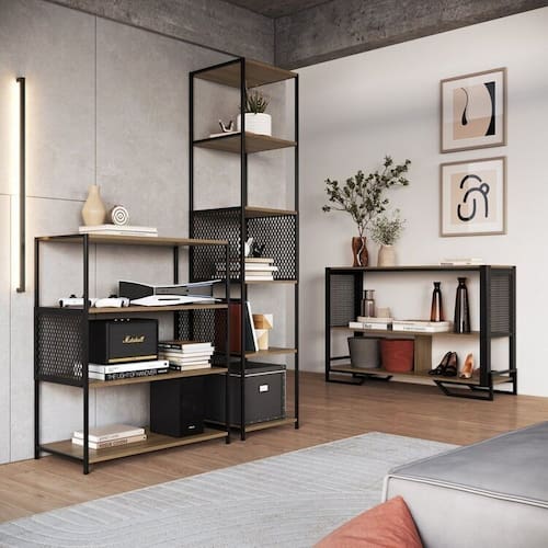 Estes três lindos móveis para decoração e organização vieram para completar a sua sala de estar. O seu estilo industrial e detalhes em telado dão um charme a mais ao produto. Produtos resistentes e modernos. Acabamento: Finish Foil Altura do Conjunto: 180 cm Ambiente: null Ambiente Principal: Sala de Estar Cor: Preto / Mel Informação Complementar: 1x Estante Alta 5 Prateleiras em MDP Estilo Industrial P1023 Preto/Mel Largura: 40 cm Altura: 180 cm Peso: 15 kg Profundidade: 38 cm Necessita Montagem: Sim