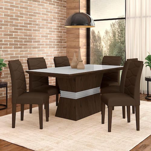 O Conjunto Sala de Jantar Nazca com 6 Cadeiras Vitória exala projetada em seu design, combinação perfeita de materiais luxuosos e detalhes sofisticados, criando um ambiente encantador e convidativo.