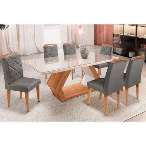 Sala de Jantar Completa Alvorada c/ Tampo Madeirado c/ Vidro 180x90cm e 6 Cadeiras Melissa Imbuia/Grafite - Rufato