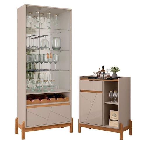 Conheça a Sala de Jantar Bari que combina elegância e funcionalidade com a Cristaleira e o Aparador Bar. A Cristaleira Bari possui 2 portas de vidro temperado e 1 gaveta, com estrutura em MDP e MDF e acabamento em pintura UV. Dobradiças metálicas, puxadores de couro ecológico, e prateleiras de vidro garantem organização e estilo. Com espaço para 5 garrafas, é prática e moderna. O Aparador Bar Bari, feito em MDP e MDF, tem uma porta usinada com sistema push-open e uma gaveta com corrediças telescópicas. O puxador de metal e a prateleira externa oferecem modernidade, enquanto os pés de madeira maciça com feltro garantem estabilidade. Ideal para salas de estar ou jantar.