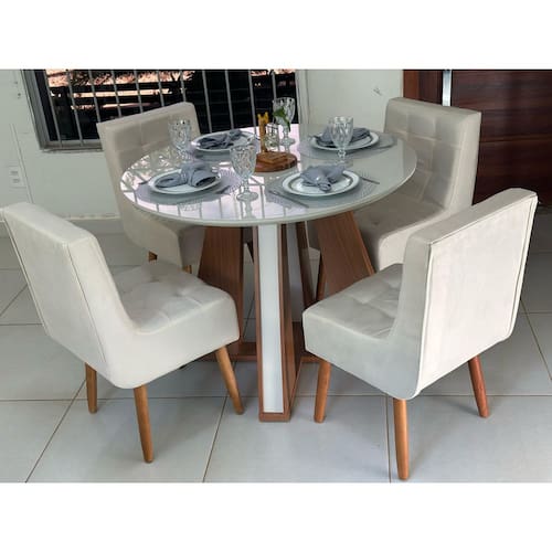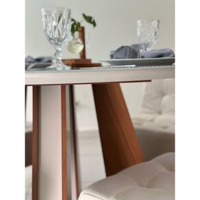 Particularidades da Mesa: Características: - Desing moderno; - Vidro Serigrafado Temperado 4mm; - Tampo Tamburato Chanfrado; - Estrutura em MDF; - Cor do tampo: Off White;