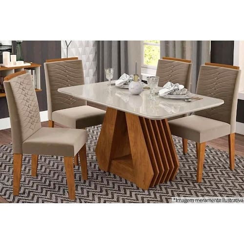 Abaixo segue os produtos do KIT: Sala de Jantar Completa Ágata c/ Tampo Madeirado 130cm e 4 Cadeiras Clarice Savana-Nature-Madeirado/Off White -Suede Joli Cap - Cimol
