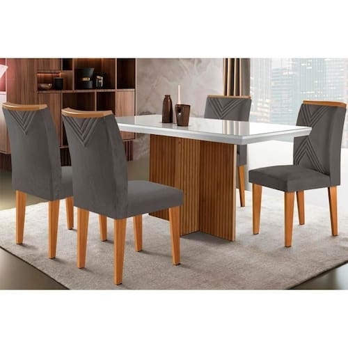 Sala De Jantar Completa Berlim C/ Tampo Madeirado C/ Vidro Canto Curvo 120x80cm E 4 Cadeiras Amsterdã Imbuia/off White - Suede Grafite - Rufato