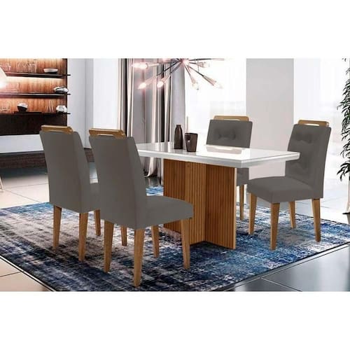 Sala de Jantar Completa Berlim c/ Tampo Madeirado c/ Vidro Canto Curvo 120x80cm e 4 Cadeiras Imperatriz Imbuia/Off White - Suede Grafite - Rufato