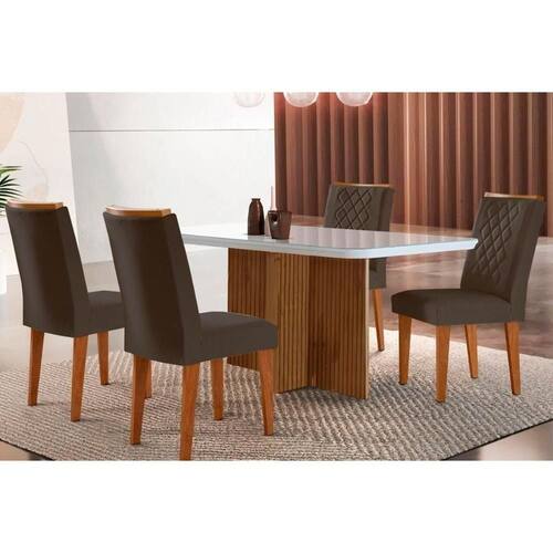 Sala De Jantar Completa Berlim C/ Tampo Madeirado C/ Vidro Canto Curvo 120x80cm E 4 Cadeiras Jade Imbuia/off White - Linho Grafite - Rufato