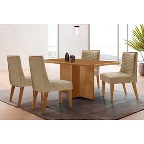 Sala de Jantar Completa Berlim c/ Tampo Madeirado Canto Curvo 120x80cm e 4 Cadeiras Maldivas Naturale - Linho Bege - Rufato