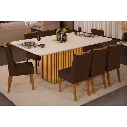 Sala de Jantar Completa Canes Tampo Madeirado c/ Vidro Curvo 200x100cm e 8 Cadeiras Stela Cedro/Off White - Ipe/Suede Moca - DJ Móveis Abaixo segue os produtos do KIT: Sala de Jantar Completa Canes Tampo Madeirado c/ Vidro Curvo 200x100cm e 8 Cadeiras Stela Cedro/Off White - Ipe/Suede Moca - DJ Móveis