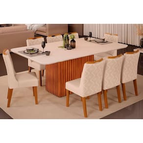 Abaixo segue os produtos do KIT: Sala de Jantar Completa Canes Tampo Madeirado c/ Vidro Curvo 200x100cm e 8 Cadeiras Stela Freijo/Off White - Ipe/Linho Neve - DJ Móveis