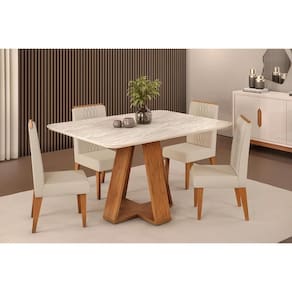 Sala de Jantar Completa Celeste c/ Tampo Madeirado Curvo 120x90cm e 4 Cadeiras Lia Freijo/Quartzo - Linho Neve - DJ Móveis