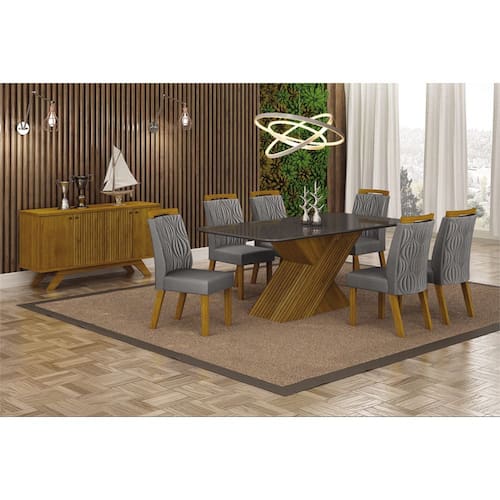 Sala de Jantar Completa com 6 Cadeiras 1,80x0,90m - Ilhéus - Leifer Móveis Para uma sala de jantar receptiva e agradável, é preciso apostar nos móveis certos, sejam eles para as refeições do dia a dia ou para as confraternizações ao lado de familiares e amigos. Este conjunto esbanja modernidade na estrutura e design minimalista, tampo com bordas curvas, cadeiras com revestimento em tecido. Esta linda Sala de Jantar tem características ideais para dar um upgrade na sua decoração, de quebra, reunir todo mundo para momentos mais intimistas e divertidos. Confira e aproveite! Faz parte do anúncio: 1 Mesa de Jantar Ilhéus 1,80x0,90 6 Cadeiras Ilhéus Obs. Objetos de decoração não inclusos Particularidades da Mesa: Características: - Vidro serigrafado; - Tampo copo; - Estrutura em MDF; - Base com pintura 3D Particularidades da Cadeira: Características: - Bordado no encosto; - Aplique curvo superior; - Base e aplique em MDF; - Peso máximo suportado 120kg; - Assento e encosto com espuma D28; Dimensões da Mesa: Altura: 78 centímetros Largura: 1,80 metros Profundidade: 90 centímetros Dimensões da Cadeira: Altura: 100 centímetros Largura: 44 centímetros Profundidade: 60 centímetros Informações Importantes:. -Produtos podem apresentar diferenças de tonalidades entre a foto na tela e o produto real, devido a calibração de cor de tela. -Limpar com flanela ou pano macio. Não utilizar álcool. Não utilizar produtos abrasivos ou corrosivos. -Nós prezamos pela qualidade da entrega em primeiro lugar, trabalhamos com transportadoras altamente selecionadas e os melhores materiais de embalagem. -A montagem é de total responsabilidade do comprador. Antes de comprar, verifique o espaço disponível para a montagem. -Certifique-se de que o produto caiba em elevadores e vãos de escadas, não fazemos içamentos. Quaisquer despesas deste tipo ficam a cargo do cliente -Garantia de 3 meses contra defeitos de fabricação.