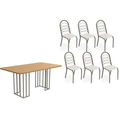 Sala de Jantar Completa Duina c/ Tampo de Madeira 160cm e 6 Cadeiras Holanda Niquel/Freijo - Courano Branco - Kappesberg